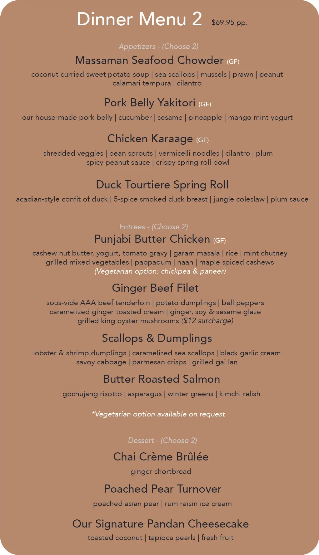 3-course menus chosen from reduced a-la-carte lunch menu: $34.95pp. (Menu 1) or $44.95pp. (Menu 2).